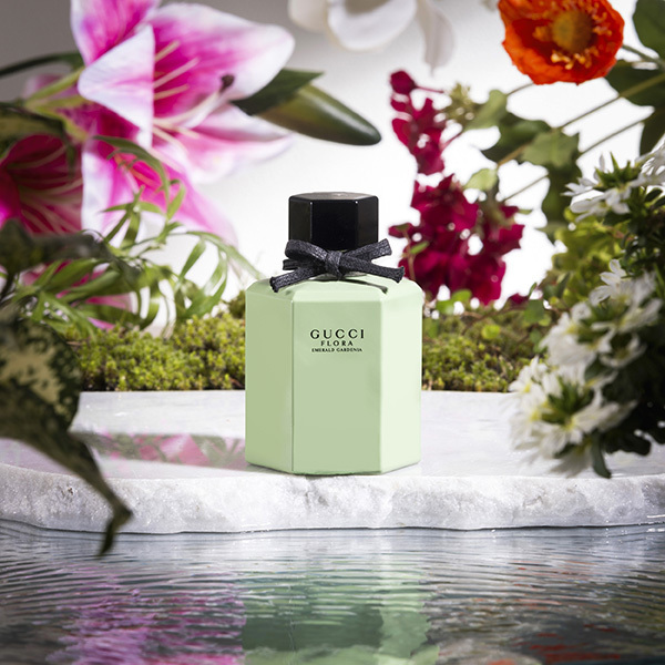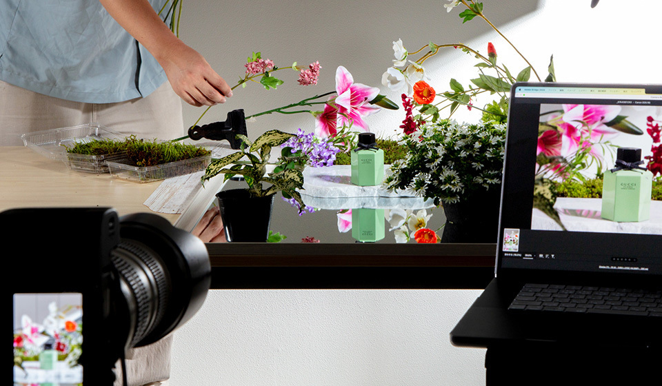 また、コスメ撮影では、香水ボトルを主役に、下には水面を、周囲には花を配置。